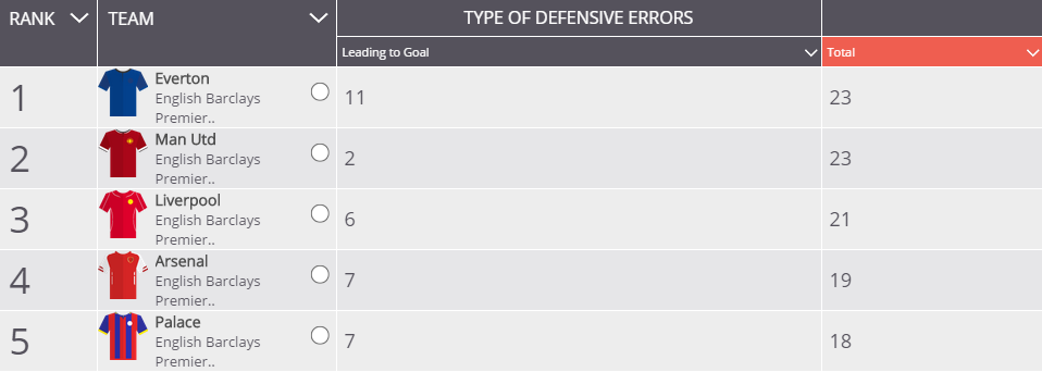 Squawkan tilastoja tarkistellessa pistää silmään yksi tilastollinen fakta. Everton on tehnyt kauden aikana 23 puolustuspään virhettä, joista vastustaja on rankaissut maalin muodossa peräti 11 kertaa. Toffeesin päästetyistä maaleista lähes kolmannes on siis tullut oman joukkueen hölmoilyiden seurauksena.
