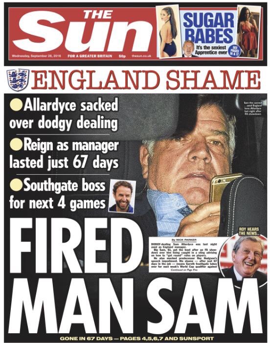 Uutinen Englannin maajoukkuemanageri Sam Allardycen pestin päättymisestä skandaaliin nousi jokaisen brittilehden etusivulle keskiviikkoaamuna.
