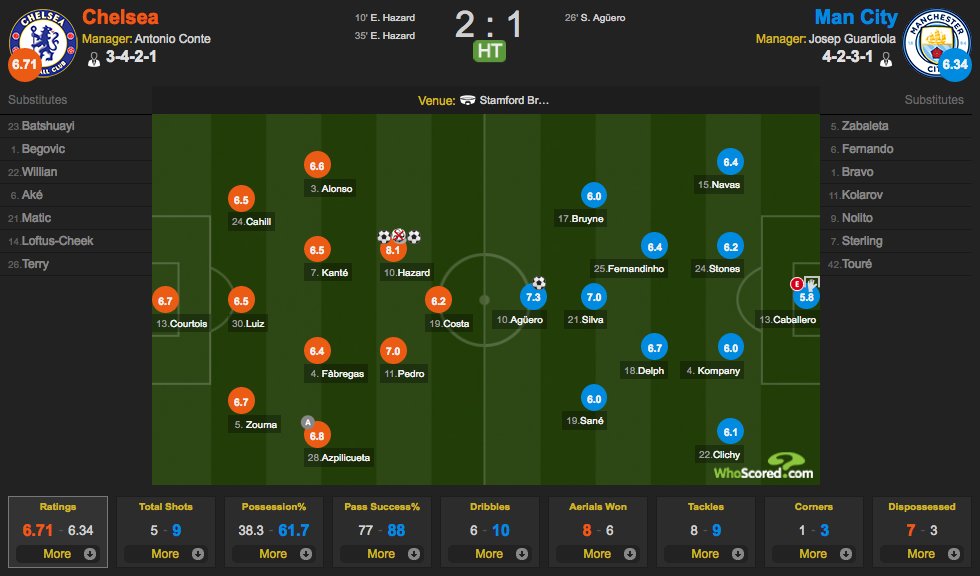 Chelsea 2-1 Man City HT: Fabian Delph has had 69 touches - more than any teammate & 33 more than any Chelsea player whoscored.com/Matches/108079…