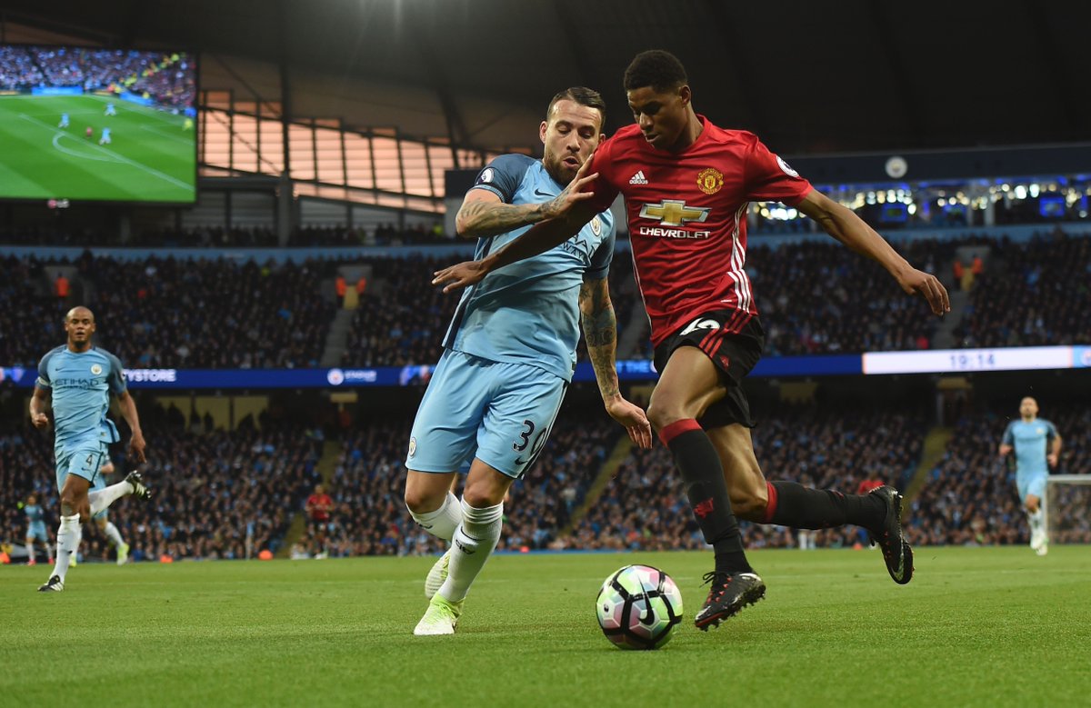 United aloitti pelin räväkästi, sillä ensimmäinen maalipaikka oli syntyä jo toisella minuutilla. Ander Herrera lähetti yhdellä kosketuksella loistavan keskityksen kohti takatolppaa, mutta Pablo Zabaleta siivosi pallon kulmapotkuksi ennen kuin Marouane Fellaini ehti maalintekoon. Kun kello näytti yhdeksää minuuttia, Kevin De Bruyne löysi aivan yhtäkkiä nappisyötöllään maalin edestä Sergio Agüeron. Argentiinalaisen suora jatko osui kuitenkin vain ulkotolppaan. Avausjakson ensimmäisen puolikkaan hahmo oli loistavaan kevätvireeseen päässyt Marcus Rashford, joka piti nopeudellaan ja kikoillaan City-puolustusta jatkuvasti ahtaalla. Etenkin Nicolas Otamendi joutui pelaamaan jo aivan kykyjensä ylärajoilla. Vahvaa jaksoa Unitedin pelaajista pelasivat myös Herrera ja Michael Carrick. 25. minuutilla City-vahti Claudio Bravo aiheutti ties kuinka monennen kerran tällä kaudella sydämentykytyksiä joukkueensa kannattajille. Chileläinen lähti ulos maaliltaan ja tupeloi pallon suoraan Henrikh Mkhitarjanille, mutta Cityn onneksi Bravo ehti vielä torjumaan omasta mokastaan syntyneen tilanteen. Torjunta jäi Bravon avausjakson ainoaksi. Unitedin puolustusta piti hereillä etenkin Agüero. 32 peliminuutin täyttyessä David De Gea joutui torjuntatöihin ensimmäistä kertaa. Agüero napautti 20 metristä komean kudin kohti alakulmaa, mutta espanjalaisvahti liimasi pallon näyttävästi hanskoihinsa. Agüeron maalijano oli kuitenkin valtava, sillä sen verran ahnaasti mies haki maalipaikkoja jatkuvalla syötöllä. Aivan ensimmäisen puoliajan lopussa nähtiin koko jakson paras maalipaikka. Marcus Rashfordin vapaapotku löysi takatolpalta aivan vapaana Ander Herreran, joka kuitenkin puski pallon maalin ohi. Leroy Sané oli ajatuksissaan jo taukoteellä pukukopissa, sillä niin vapaasti nuori saksalainen antoi Herreran juosta palloon. Ensimmäisellä puoliajalla ei maaleja nähty eikä kunnon maalipaikkojakaan ylenpalttisesti. Intensiteetti oli joka tapauksessa korkea. Vaikka tunteet olivatkin pinnassa ja otteet ajoittain kovat, ei erotuomari Martin Atkinson nostanut avausjaksolla kortteja taskustaan kertaakaan.