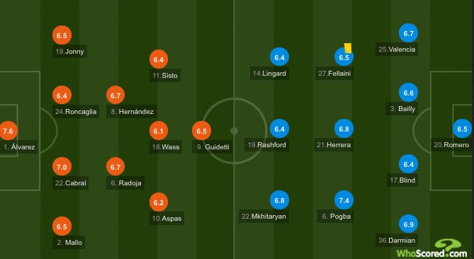 United sai sairastuvalta takaisin avauskokoonpanoon Eric Baillyn ja Paul Pogban. Chris Smalling puolestaan oli toipunut riittävästi tullakseen mukaan vaihtopenkille. Tolppien välissä nähtiin Sergio Romero, kuten Eurooppa-liigassa oli ollut tapana.