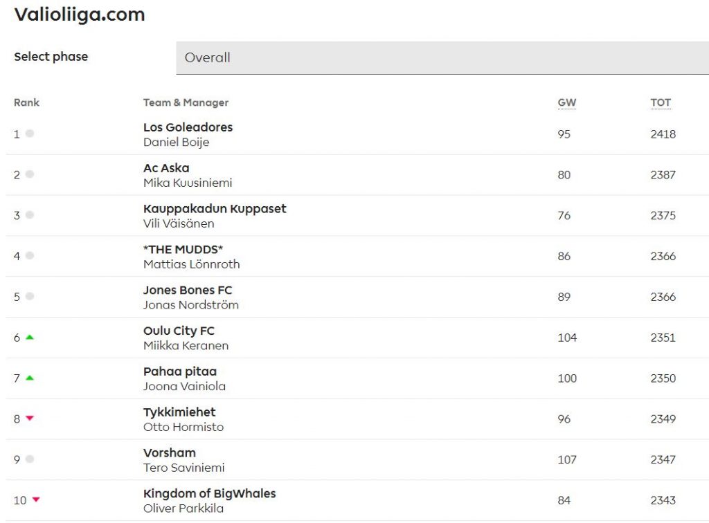 Sarjan voitti helsinkiläinen Daniel Boije. Hän keräsi joukkueella Los Goleadores yhteensä 2 418 pistettä. Saldo on kova, sillä Boije oli koko maailmanlaajuisessa kilpailussa 431:s. Valioliigan järjestämään kisaan otti osaa yhteensä noin 4,5 miljoonaa pelaajaa. Valioliiga.comin sarjassa pelaajia oli yhteensä 369.