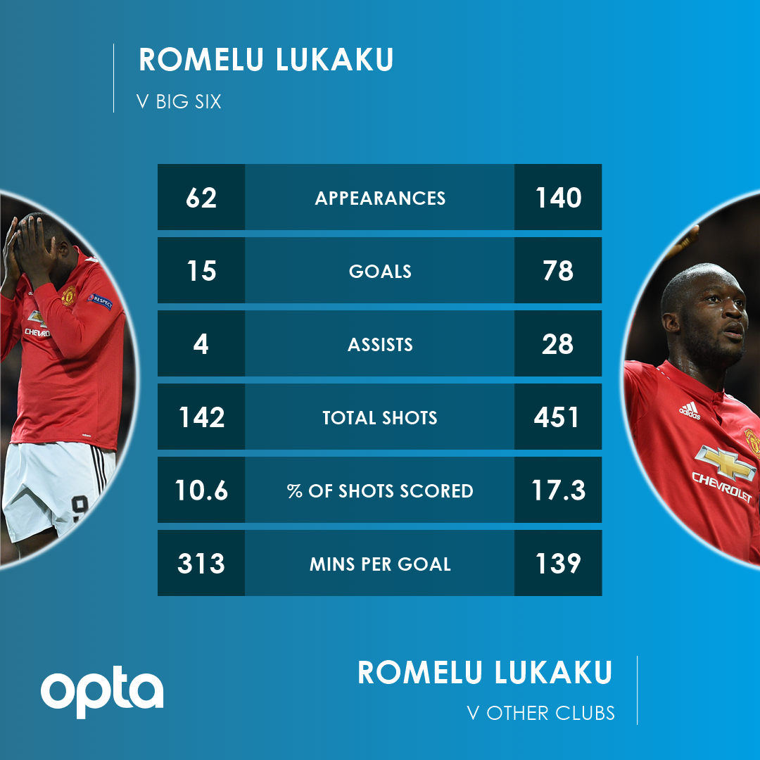 15 - Romelu Lukaku has scored 15 goals in 62 Premier League appearances against the "big six" clubs, averaging a goal every 313 minutes. Against the other clubs, he's scored every 139 mins (78 goals in 140 games). Struggle.