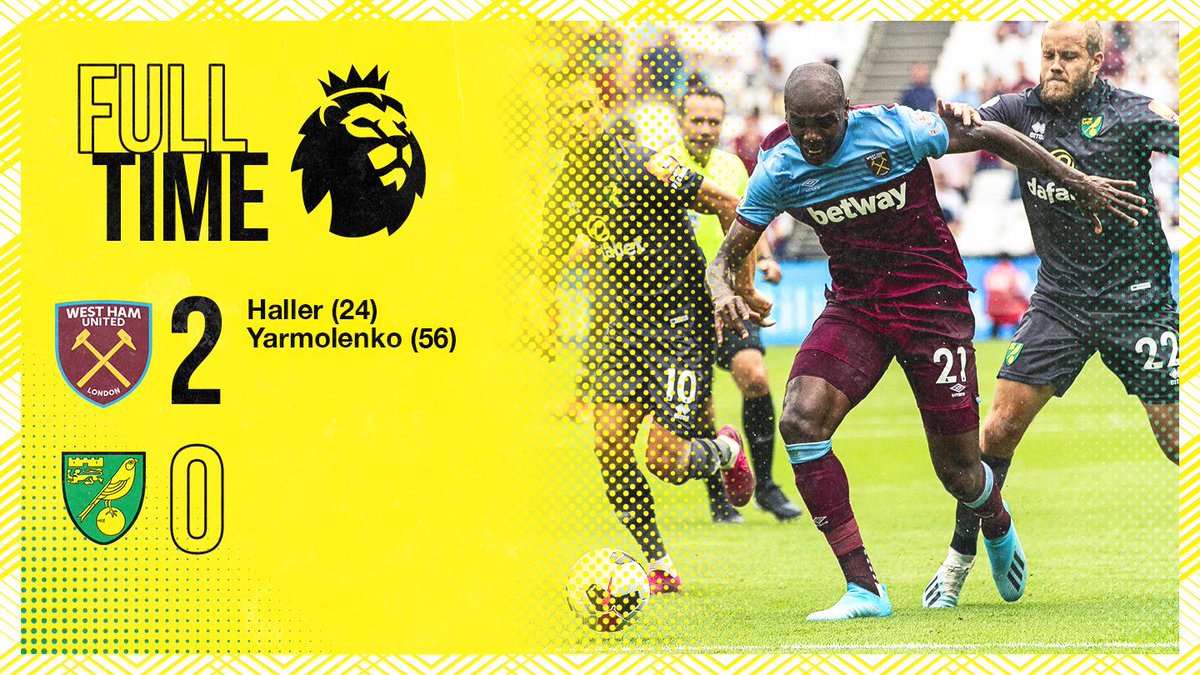 Sébastien Haller vei West Hamin 1-0-johtoon 24 minuutin pelin kohdalla, kun Athur Masuaku murtautui vasenta laitaa pitkin Norwichin boksiin ja keskitti pallon matalana seuran jättihankinnalle. Tim Krul ei ehtinyt millään pallon tielle, kun saksalaiskärki tuikkasi pelivälineen lähietäisyydeltä sisään.