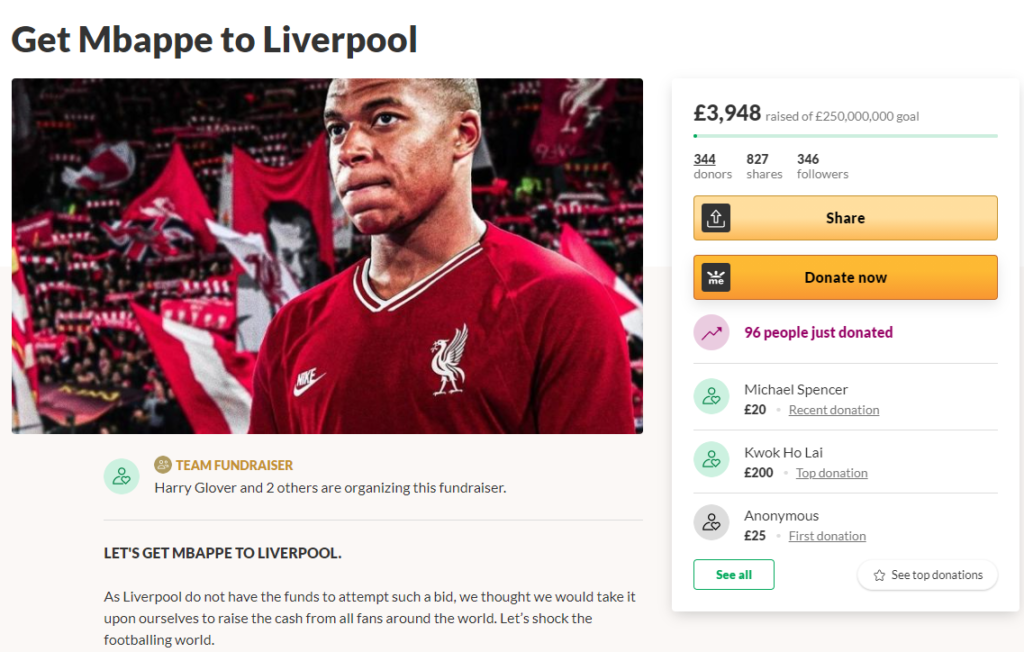 Joukko Liverpoolin kannattajia on aloittanut joukkokeräyksen, jonka tavoitteena on saada kasaan 250 miljoonaa puntaa (noin 291 miljoonaa euroa) Kylian Mbappén hankintaa varten.