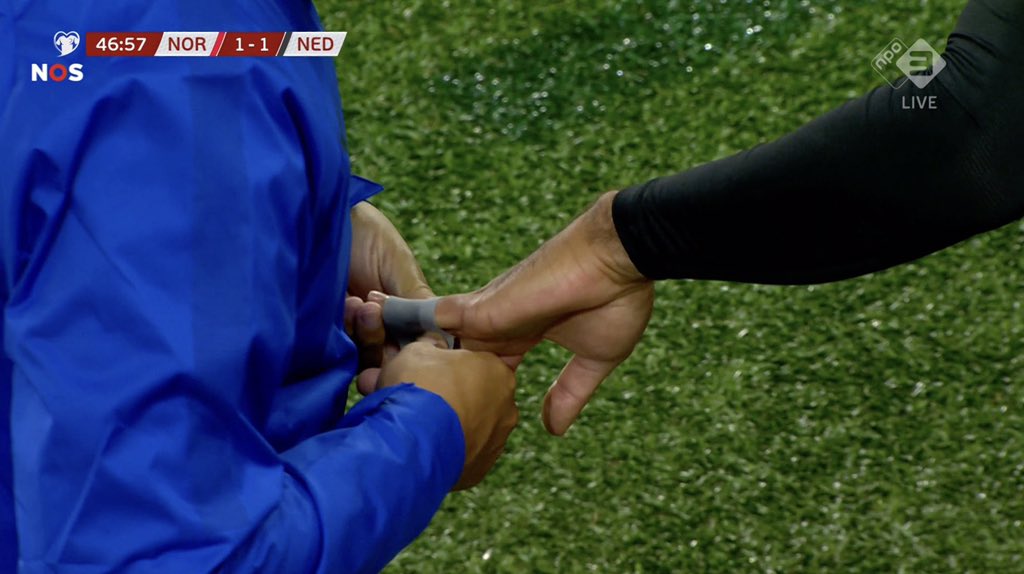 Televisiokuvissa näkyi, kuinka Hollannin maajoukkueen lääkäri naksautti van Dijkin sormen takaisin paikalleen ja teippasi sen tukevasti.