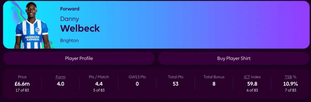 Welbeckin maaliodottama ilman rangaistuspotkuja on 0,53, joka on huomattavasti Thiagon vastaavaa lukua korkeampi. Lisäksi Brightonin hyökkäyspään data on parempaa kuin Brentfordin, joskin Brentfordin otteluohjelma on peliviikosta 16 eteenpäin huomattavasti Brightonia suosiollisempi. Brighton kohtaa peliviikolla 14 Aston Villan, jonka jälkeen seuraavat kolme vastustajaa ovat West Ham, Liverpool ja Sunderland.