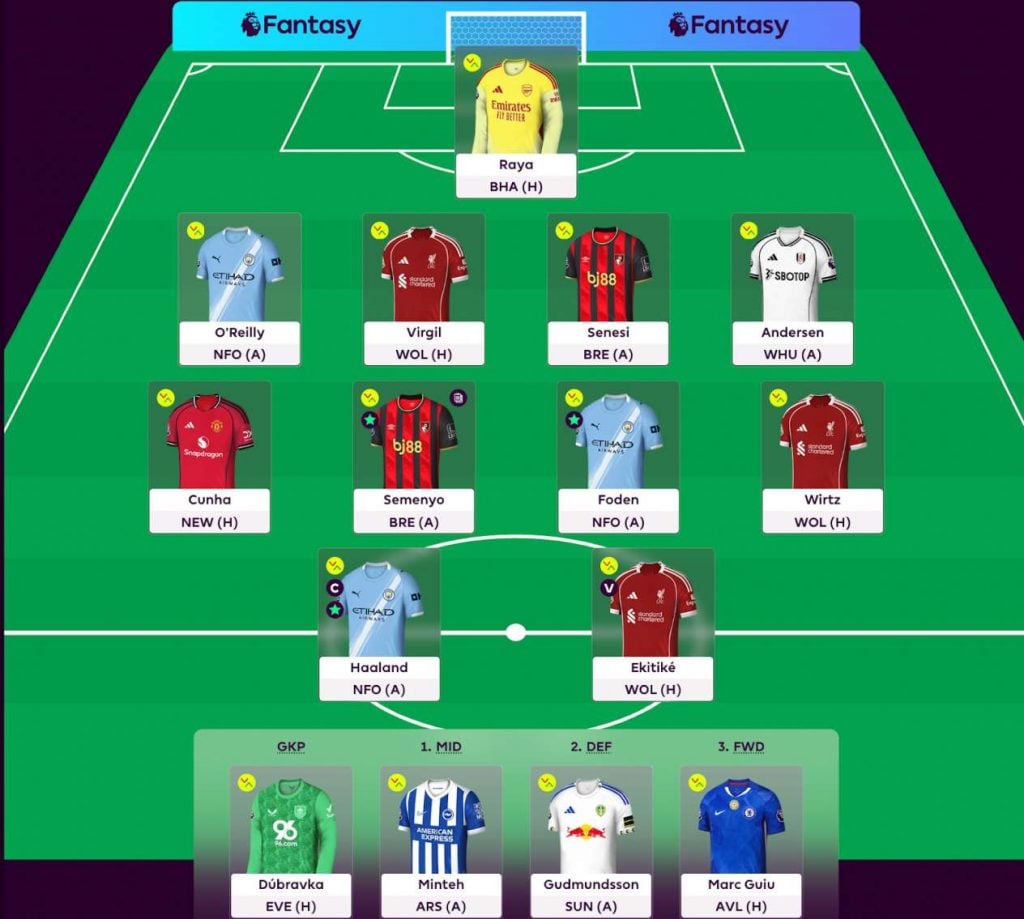 Toimituksen joukkue ryhmittyy peliviikolle 18 yllä olevalla kokoonpanolla. Kapteeninnauhan saa käteensä Erling Haaland.