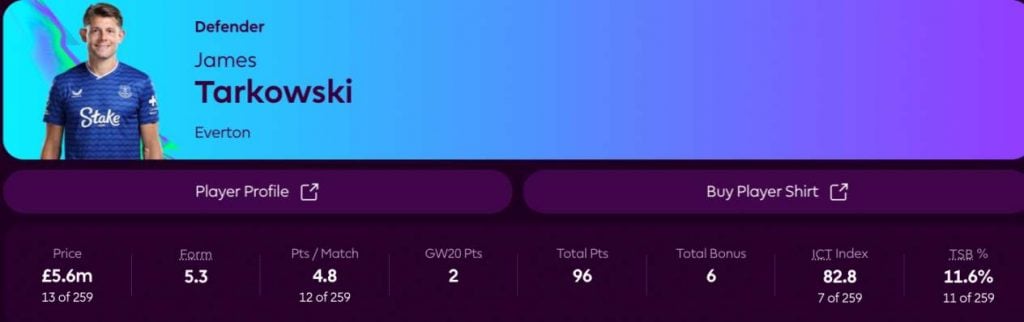 Huolimatta joukkueen rumasta 2-4-tappiosta Evertonin puolustus on liigan keskikastia, ja Tarkowski kerää puolustuspään osallistumispisteitä tasaiseen tahtiin. Englantilaisen pisteodottama seuraavalle viidelle viikolle on erinomainen 18,9.