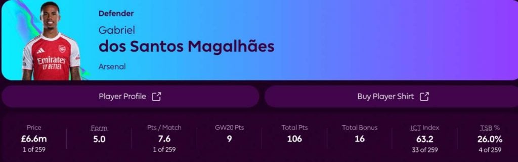 Mikäli manageri omistaa jo kolme Arsenalin pelaajaa, Gabrielin hankinta ei ole välttämättä prioriteettilistan kärjessä. Ihanteellinen kombinaatio on todennäköisesti kaksi Arsenalin puolustajaa ja Declan Rice tai Bukayo Saka.