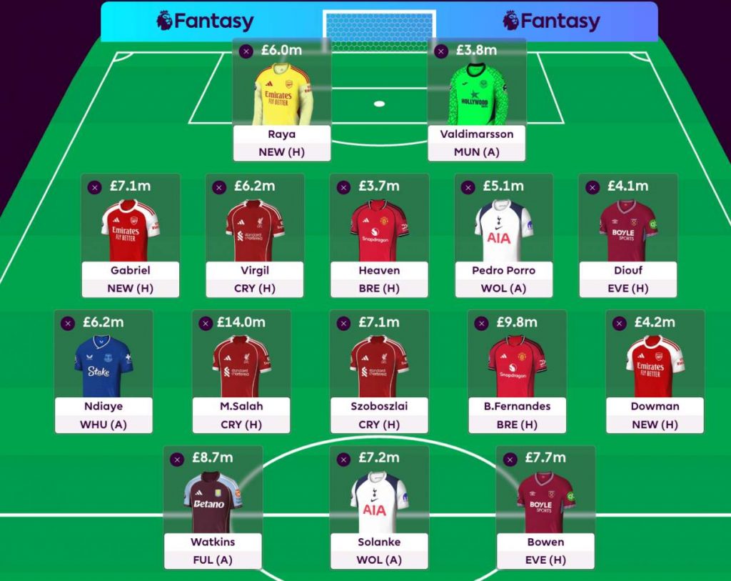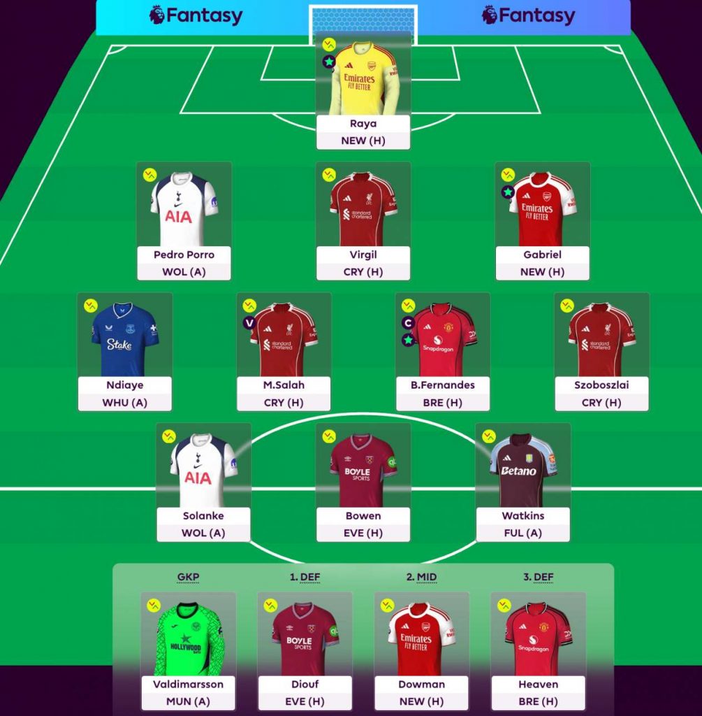 Fernandes on todennäköisesti pelin paras pelaaja ja Man Unitedin hyökkäyspään moottori. Salah ja Szoboszlai kohtaavat todennäköisesti rotaatiota harjoittavan Palacen, minkä vuoksi molemmat ovat joukkueessa. Ndiaye on mukana, kun joukkue kohtaa putoamistaistelussa olevan West Hamin, minkä lisäksi senegalilainen ampuu joukkueen rangaistuslaukaukset. Dowman putoaa tässä tapauksessa penkille.